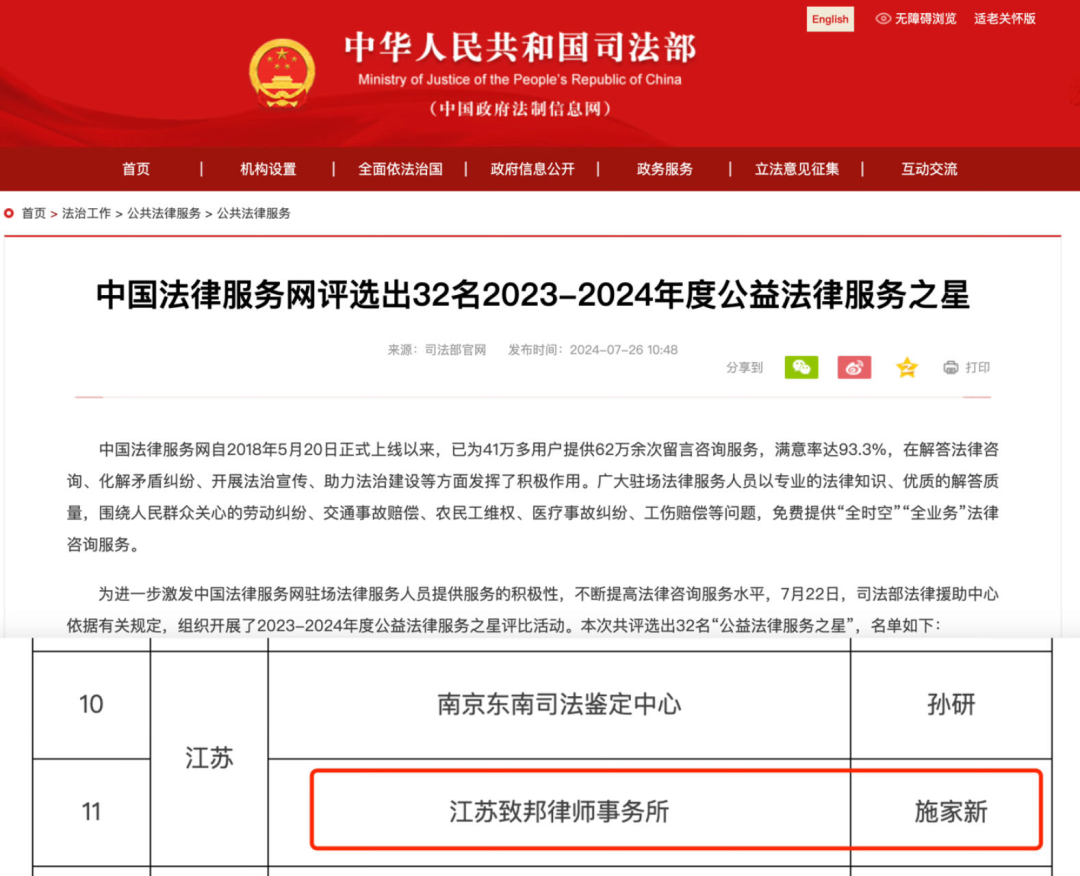 近日,司法部法律援助中心組織開展2023-2024年度公益法律服務(wù)之星評(píng)比活動(dòng),評(píng)選出32名“公益法律服務(wù)之星”,江蘇致邦律師事務(wù)所高級(jí)合伙人、第一黨支部書記施家新上榜,是江蘇省唯一獲此殊榮的律師。