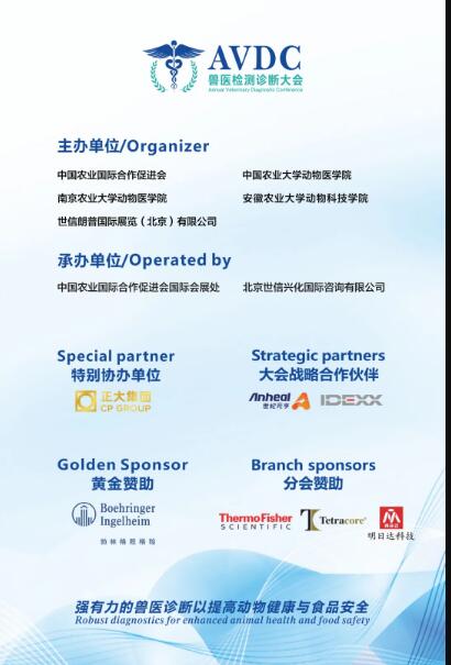 本次大會(huì)由中國農(nóng)業(yè)國際合作促進(jìn)會(huì)、中國農(nóng)業(yè)大學(xué)動(dòng)物醫(yī)學(xué)院、南京農(nóng)業(yè)大學(xué)動(dòng)物醫(yī)學(xué)院、安徽農(nóng)業(yè)大學(xué)動(dòng)物科技學(xué)院、世信朗普國際展覽(北京)有限公司主辦;由中國農(nóng)業(yè)國際合作促進(jìn)會(huì)國際會(huì)展處和北京世信興化國際咨詢公司承辦;正大集團(tuán)為特別協(xié)助單位,世紀(jì)元亨和愛德士為戰(zhàn)略合作伙伴單位和贊助,勃林格殷格翰為黃金贊助,賽默飛、泰吉科和明日達(dá)科技為分會(huì)贊助。