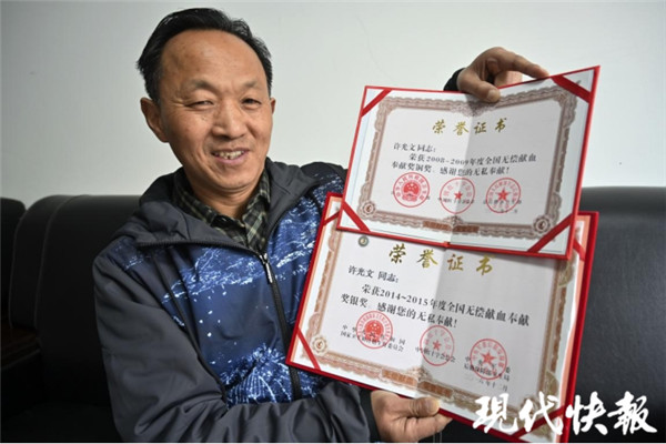 △ 許光文多次榮獲全國(guó)無(wú)償獻(xiàn)血奉獻(xiàn)獎(jiǎng)