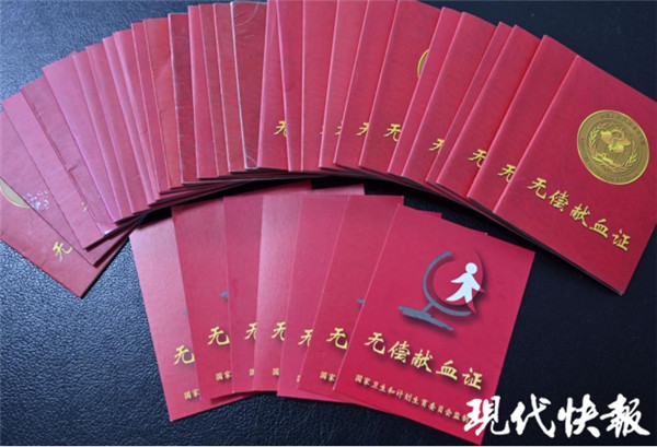 當(dāng)許光文拿出自己的獻(xiàn)血證時(shí),40多本獻(xiàn)血證攤開(kāi)來(lái)滿滿當(dāng)當(dāng)?shù)劁伭艘蛔雷印,F(xiàn)代快報(bào)記者了解到,近20年來(lái),許光文堅(jiān)持每年獻(xiàn)血,如今已無(wú)償獻(xiàn)血56次,獻(xiàn)血量累計(jì)達(dá)到9000余毫升,遠(yuǎn)遠(yuǎn)超出一個(gè)成年人全身血液的總量。