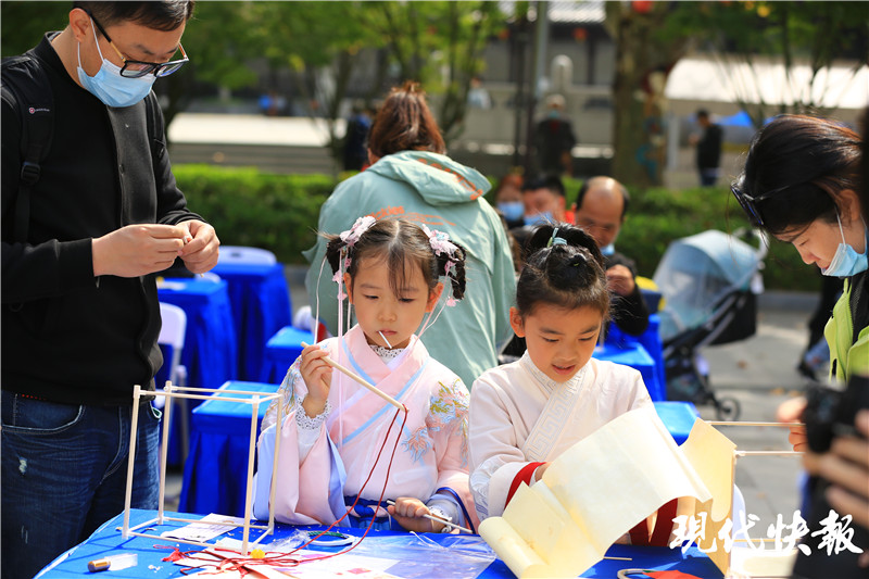 現(xiàn)代快報(bào)記者看到,上午10點(diǎn),現(xiàn)場(chǎng)便吸引了眾多對(duì)中國(guó)傳統(tǒng)文化感興趣的市民及游客,不少小朋友對(duì)國(guó)風(fēng)展現(xiàn)出濃厚的興趣,并積極參與到活動(dòng)中來。在國(guó)學(xué)課堂環(huán)節(jié),主持人現(xiàn)場(chǎng)提問關(guān)于國(guó)風(fēng)的課外知識(shí)。小朋友們踴躍舉手作答,不僅能準(zhǔn)確說出答案,還能講出其中典故。在傳統(tǒng)國(guó)韻游戲環(huán)節(jié),小朋友們總能玩出新花樣,創(chuàng)意十足!