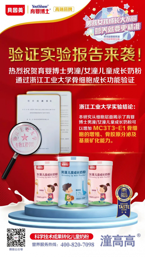 育嬰博士男潼女潼兒童奶粉通過浙江工業(yè)大學(xué)骨細(xì)胞成長功能驗(yàn)證!科學(xué)營養(yǎng),助力長高