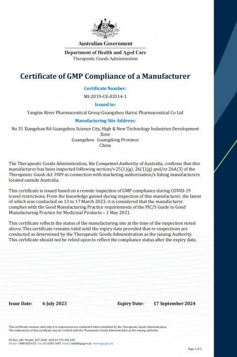 7月6日,揚(yáng)子江藥業(yè)集團(tuán)廣州海瑞藥業(yè)有限公司(以下簡(jiǎn)稱“海瑞藥業(yè)”)凍干粉針劑1號(hào)車(chē)間通過(guò)澳大利亞“健康醫(yī)療物資總署”TGA(Department of Health, Therapeutical Goods Administration)GMP認(rèn)證,同時(shí)也具備了生產(chǎn)符合美國(guó)、新西蘭、意大利、法國(guó)、日本、新加坡等PIC/S成員國(guó)要求產(chǎn)品的條件。