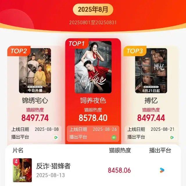 由霍建華、黃宗澤強(qiáng)強(qiáng)聯(lián)合,主演的短劇《搏憶》收官了。八月份短劇熱播排行榜上熱度僅僅排到第三,距離還比它遲將近一個(gè)星期播出的不知名演員出演的土味短劇《飼養(yǎng)夜色》,還有一定差距。